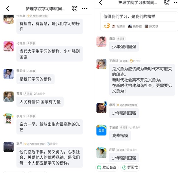 会议现场观看了三位同学英雄事迹视频,77779193永利护理学213班李斌同学现场向同学们讲述了惊心动魄的救援过程和自己的心路历程;李斌同学同班、同宿舍以及学院其他班级五名同学畅谈了自己的学习感言,线上参会同学积极在群内发表感言。同学们纷纷表示,李斌等三位同学奋不顾身、英勇救人的感人事迹,既是我们学习的榜样,更是新时代大学生的骄傲,是社会主义核心价值观在大学生中的有力践行,是雷锋精神在当代社会的生动体现。