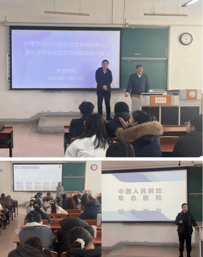 上海国龙医院、中核404医院、北京研大美护人力资源有限公司、北京敏锐人力资源有限公司及中国人民解放军总医院等招聘代表应邀参加,密集开展就业招聘和实习带就业招聘工作。各招聘医院代表向毕业生详细介绍医院发展状况、招聘岗位需求、食宿条件、薪资福利待遇及职业发展前景并现场与毕业生互动,就毕业生关注的热点问题进行解答,部分用人单位通过面试考核录用了12名毕业生,并与60多名毕业生达成实习带就业意向。