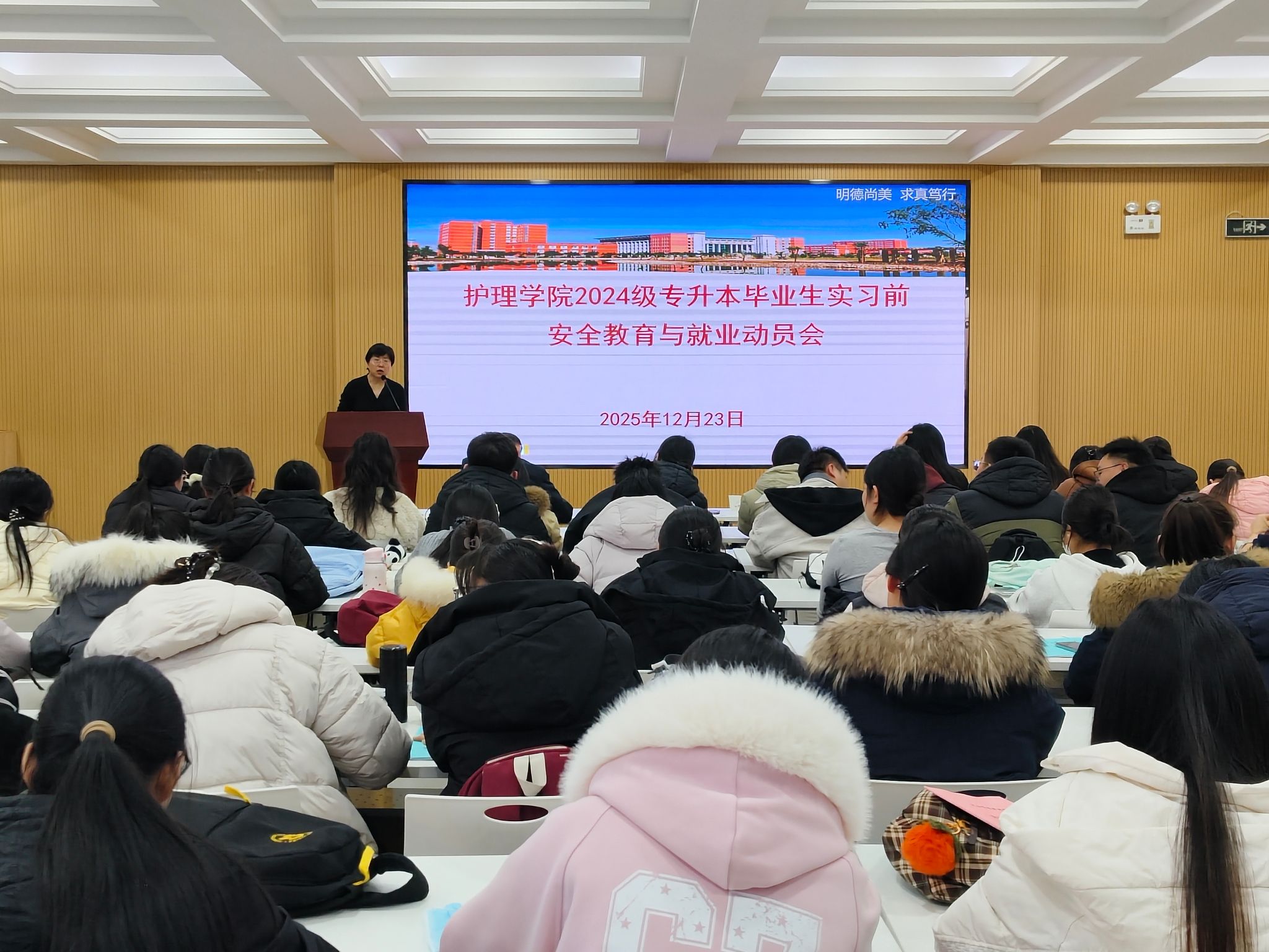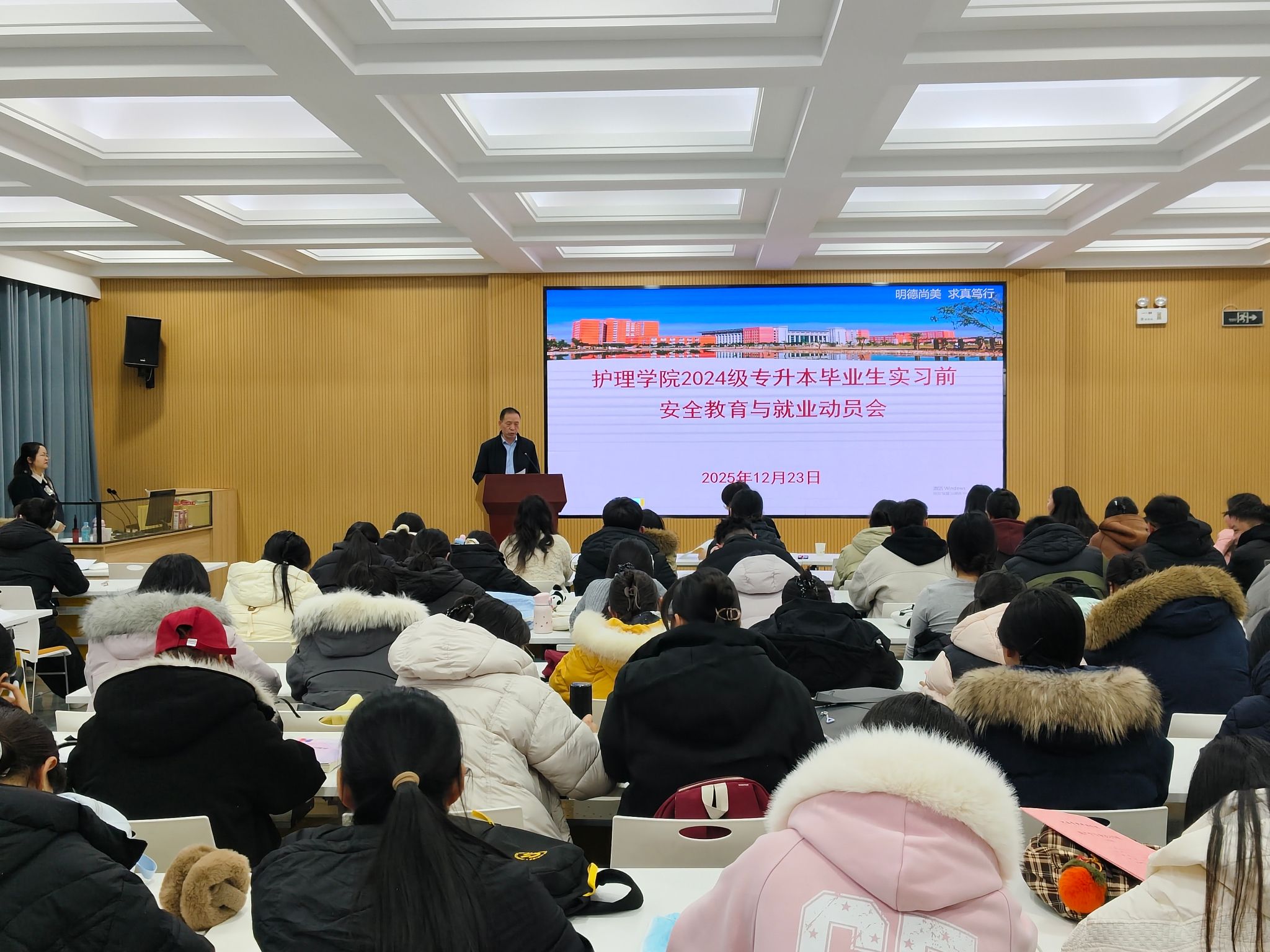 为做好2026届护理、助产专业专升本毕业生实习安排与就业指导工作,2025年12月23日,77779193永利在学生发展中心二楼就业招聘大厅召开实习前安全教育与就业动员大会。学院领导班子、毕业班班主任、辅导员及全体184名2026届专升本毕业生参会。